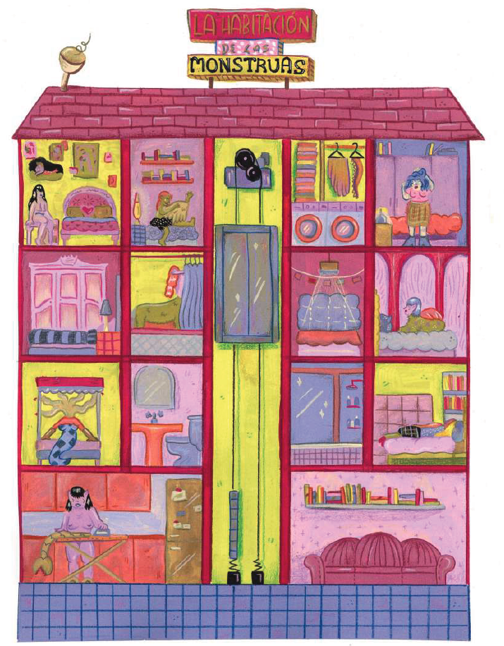 Gagnante du concours coorganisé par le festival barcelonais Comic Barcelona et Lyon BD, Carmen a passé sa résidence de trois mois à Lyon à travailler sur son projet de bande dessinée La habitación de las monstruas. Exposée une première fois à Barcelone, son exposition nous est présentée : dans son univers, les femmes se déguisent en créatures mythologiques pour échapper au regard masculin. Lola, l’héroïne, perd son costume après une nuit avec Cholo et doit affronter le monde sans protection. Ce voyage déclenche une remise en question du déguisement comme défense…